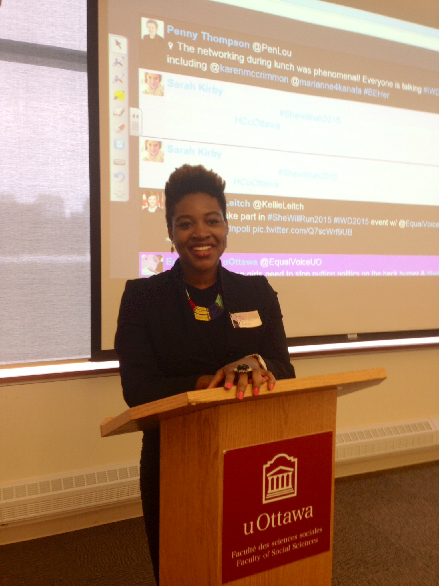 Chiamaka was invited by the University of Ottawa’s Equal Voice branch to host and moderate the team’s annual She Will Run conference. The event which was aimed at encouraging young women to develop interest in politics and consider running for office in the future, took place on March 7, 2015 and attracted about 50 people. Chiamaka moderated conversations between the audience and the guest speakers – two of whom are female politicians. The minister of labour and the status of women – Hon. Kellie Leitch, the president of the Ontario Liberal Women’s Commission – Lynne Steele and a candidate of the Green Party of Canada – Lorraine Rekmans were the guest speakers. In alignment with her personal mandates, Chiamaka’s role at the event was to be non-partisan and she had suggested the idea of having interactive sessions between the audience and these political figures.